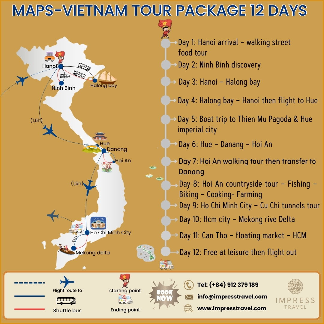 - After such eco-tour activities, you will be welcomed in the restaurant and participate in cooking classes with our chefs. Cooking classes will take place within 2 hours, the chefs will teach you how to cook Vietnamese food and share valuable information in Vietnamese cultural cuisine. Then can enjoy Vietnamese food made by yourself.